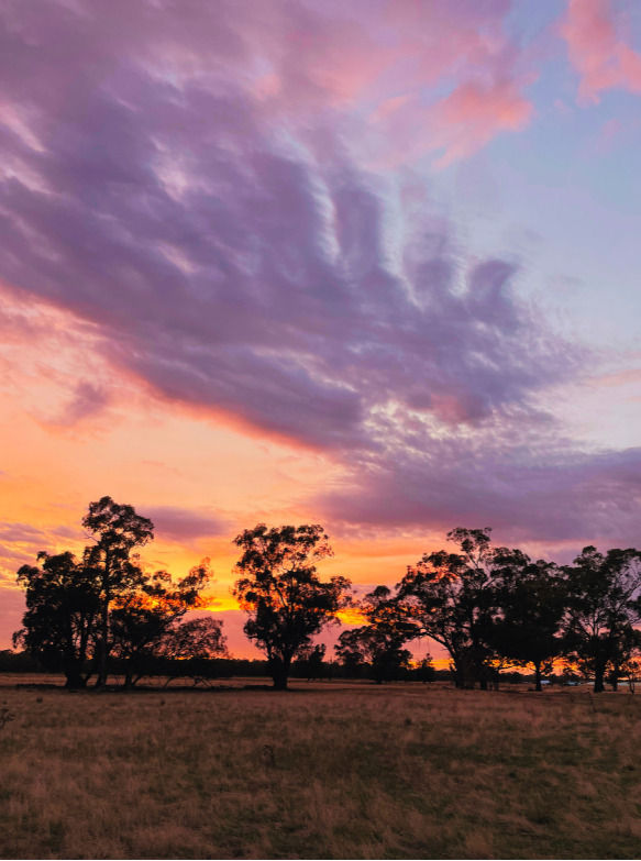 To finish I will really quickly throw my paintbrush across the paper and let you see what I see on the farm in March. Sunrise and sunsets that light up both sides of the sky – pastel yellows/oranges or glowing reds with the sun and at the same time pale pink blending to blue on the opposite horizon. Beautiful rain and warm days with grass now reaching the top of my boots in paddocks not grazed. Fire bin, marshmallows and family evenings together.